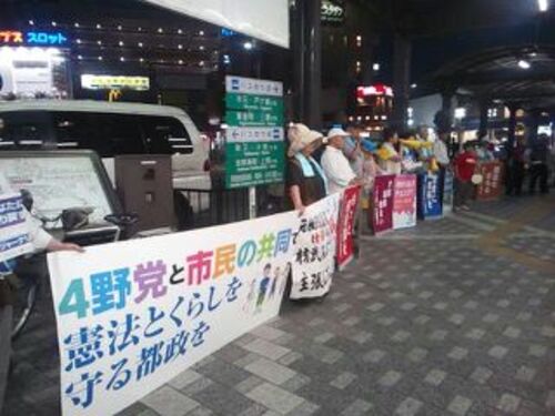昨日の高砂駅に続き金町駅でお帰りなさい宣伝。36人が参加し、新婦人のみなさんのリズムカルなメガホンで元気よく宣伝。鳥越勝利への思い一つだった。 朝宣伝は高砂駅南口。いつもは3人だが、今朝は8人。小さなプラスターを胸に貼ってがんばった方や、いつも…