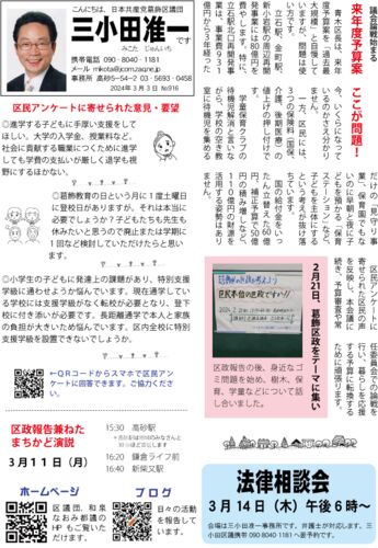 葛飾区の来年度予算案概要が発表され、詳細は区ホームページに掲載されいる。この予算案の審議が15日から始まるので、区議団としても、その予算分析を明日(7日)から3日間かけて行うことにしている。区民運動、議会論戦で前進した部分もあるのだが、問…